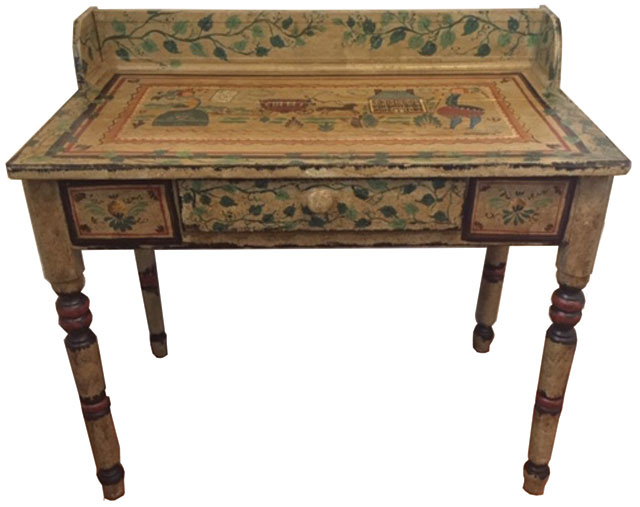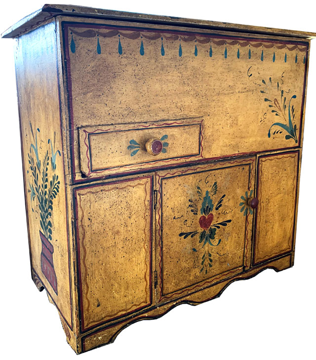 I thought this was something what I should also do when I first had my shop in my early days. One difference I tried to keep in mind was making the piece appear old using older colors with an antiqued finish. I remember once painting a desk and chair set adding my own touch and giving it an early looking antiqued finish. One piece I also remember and have used it for years was a little cabinet I got in 1967 and I couldn’t resist decorating . Although I painted it a brighter yellow base, I also made it appear a little aged in finishing touches. |